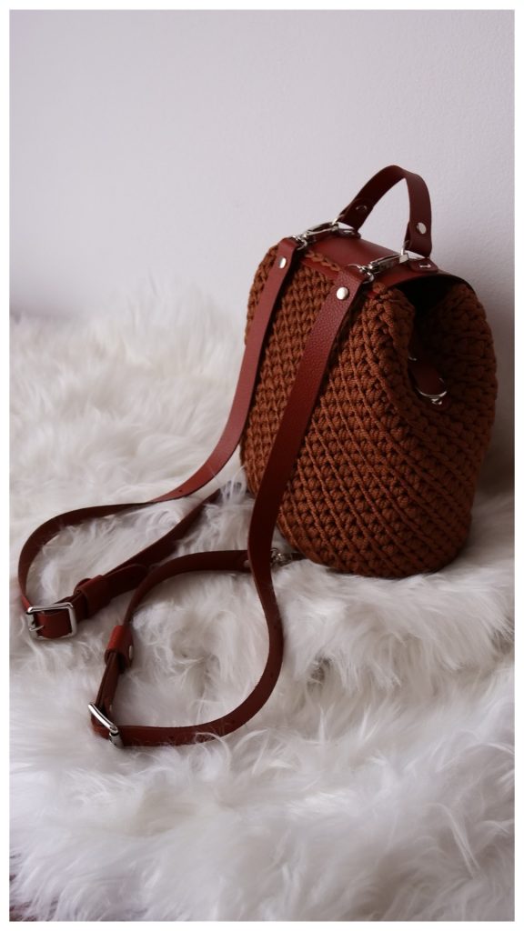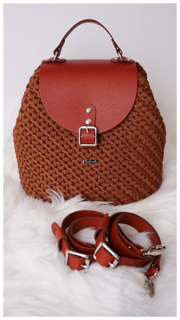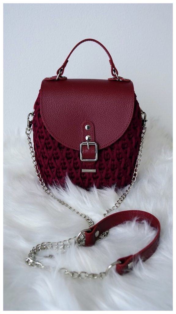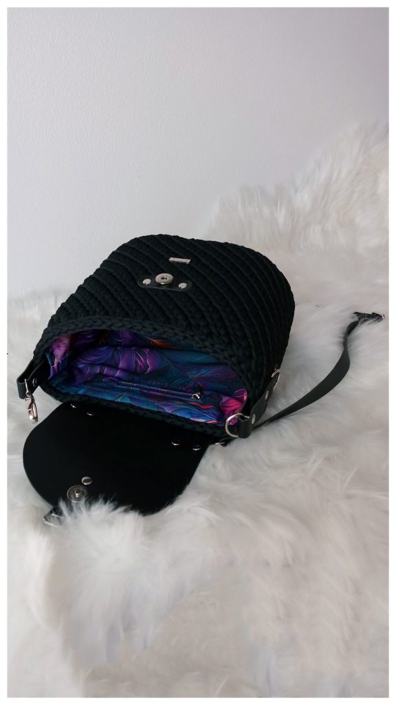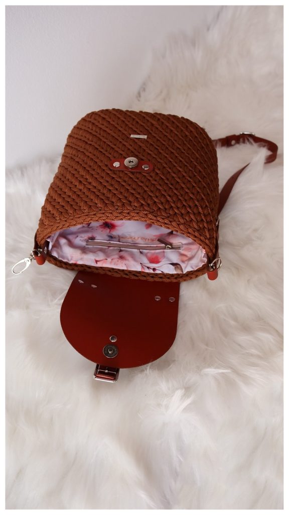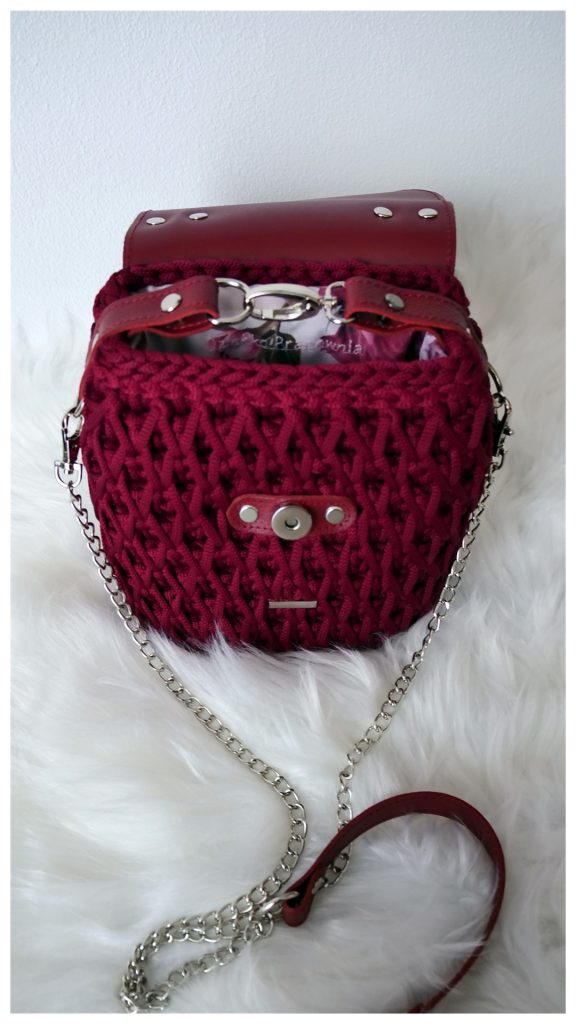 Wykonana ze sznurka poliestrowego, klapa i dodatki ze skóry naturalnej polskiej produkcji, zamykana na elegancki zatrzask magnetyczny, w środku wszyta podszewka, bez kieszonki. Zapięcie wewnętrzne długie. Wykończenie brzegu skórek: z obszyciem dekoracyjnym. Łańcuszek ze skórzaną amortyzacją o długości 120cm. Galanteria metalowa w kolorze srebrnym. Wymiary(+\-1cm): wys. 20cm, szer. 18cm, dno 17cmx10 cm.